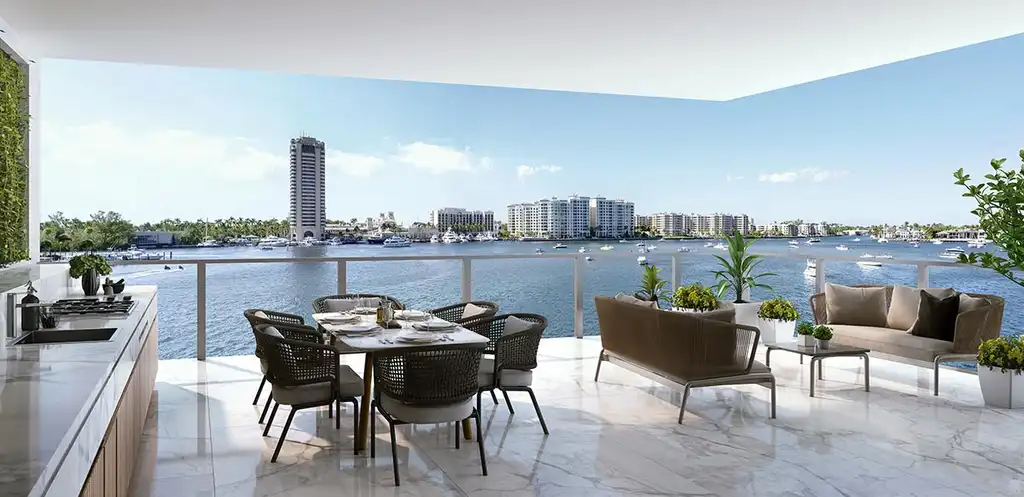 • Most residences have two private outdoor spaces, one of which faces Lake Boca Raton and is outfitted with a summer kitchen