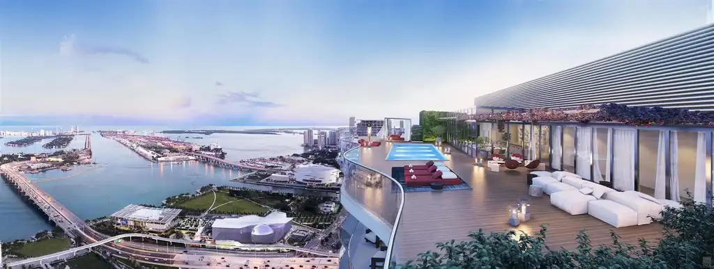 A stunning 12th floor pool deck, featuring Italian-inspired gardens designed by world-renowned landscape architect Enzo Enea, luxury spa, and 78-foot lap pool with incredible views of Biscayne Bay.
