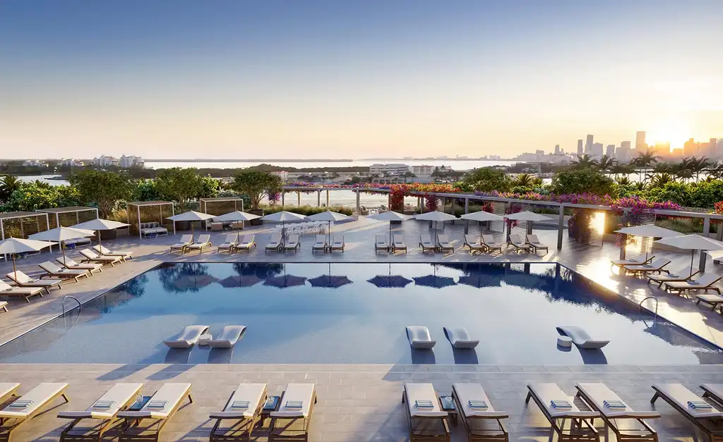 • The verdant, plant-filled amenity deck boasts breathtaking sunset views of the Miami skyline and bay, visible from both the adult & family friendly pools. The expansive space also offers unmatched relaxation with shaded trellises, a sunset terrace, numerous cabanas and lounges, and meditation deck