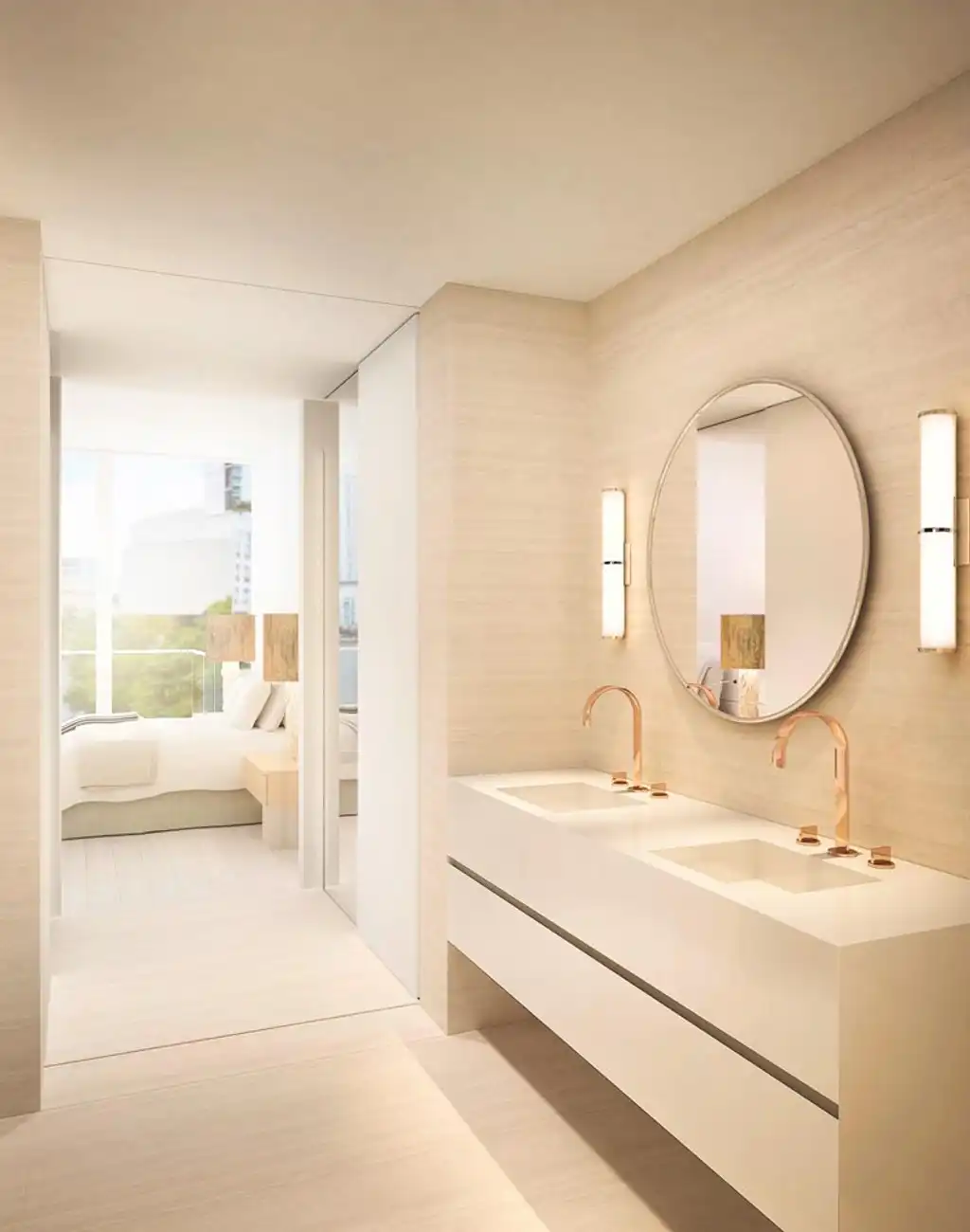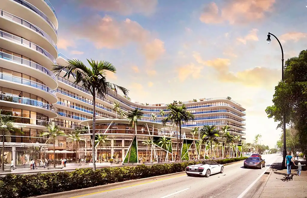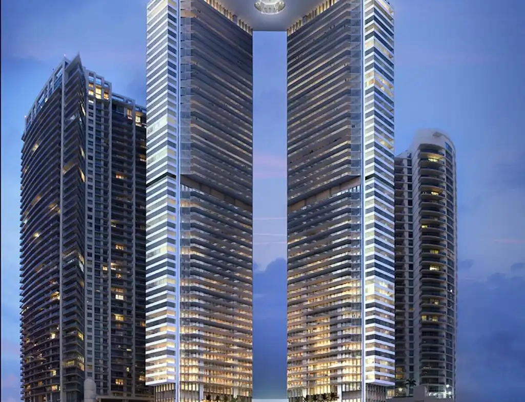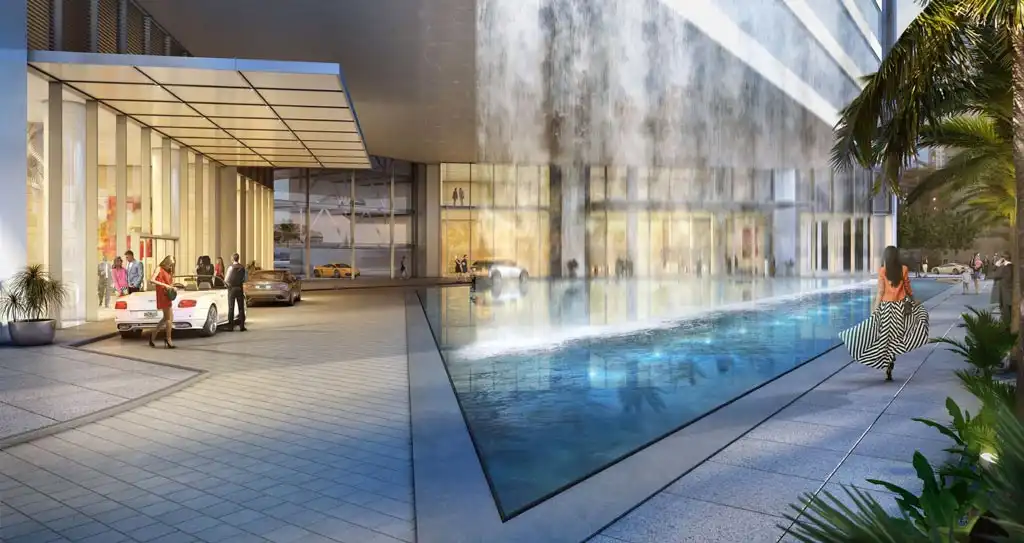 One River Point by Rafael Viñoly gives Miami’s downtown renaissance its defining architectural statement. Two slender 60-story towers rise above a floating podium from which a serene waterfall cascades 85 feet to a shimmering pool below appearing to flow into the Miami River. From its vantage point within the lush parkland setting, the elevated podium affords broad vistas across the river, the city and to the bay beyond.