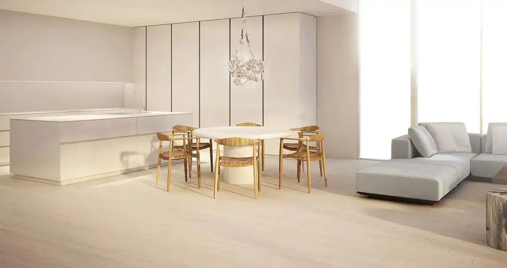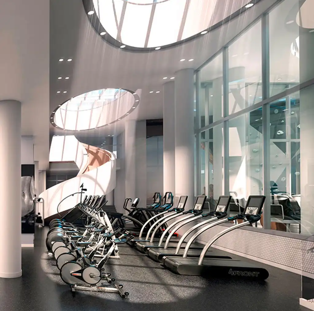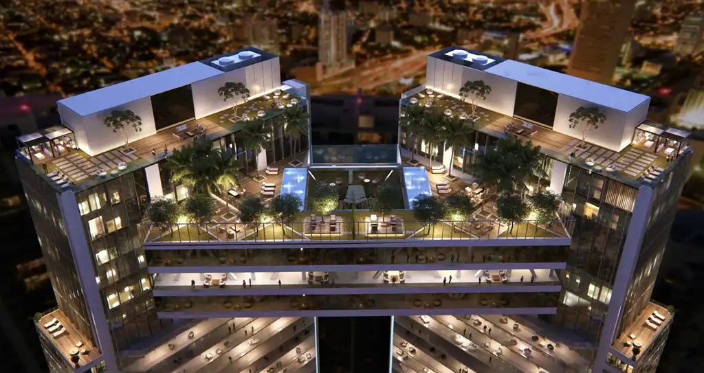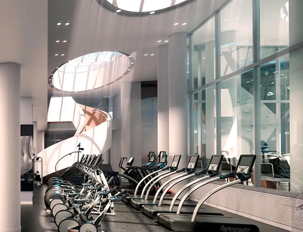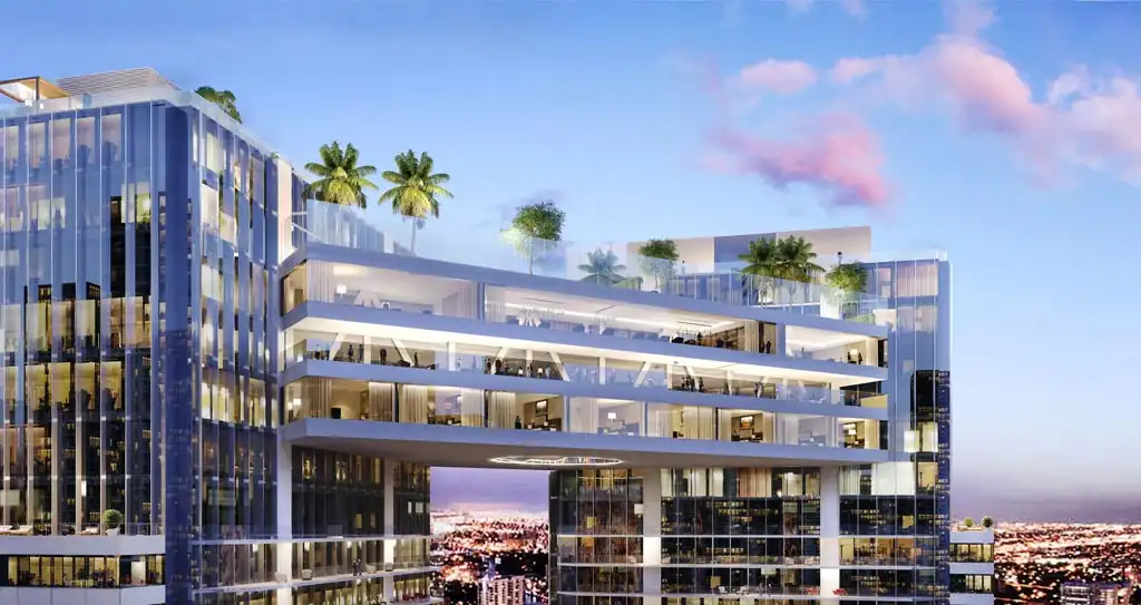 One River Point by Rafael Viñoly gives Miami’s downtown renaissance its defining architectural statement. Two slender 60-story towers rise above a floating podium from which a serene waterfall cascades 85 feet to a shimmering pool below appearing to flow into the Miami River. From its vantage point within the lush parkland setting, the elevated podium affords broad vistas across the river, the city and to the bay beyond.