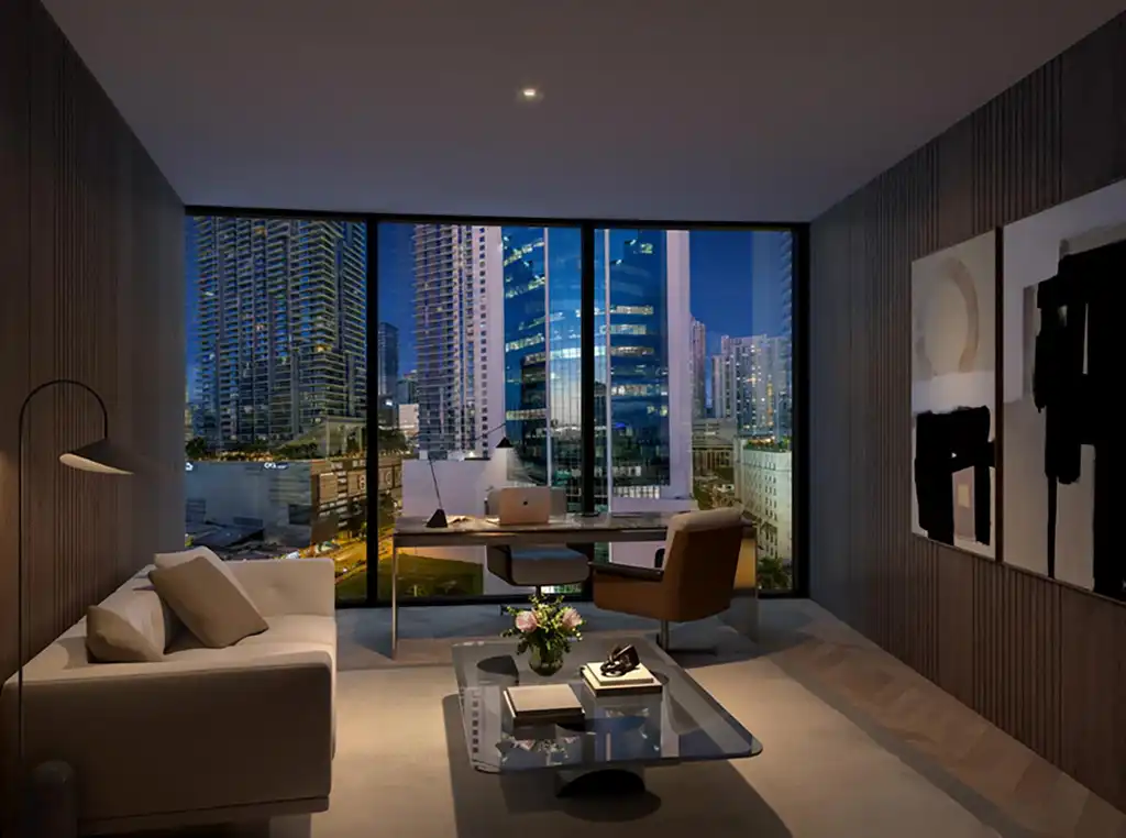 Brickell, known for its dynamic and evolving landscape, is home to world-class institutions, restaurants, and brands. One Twenty Brickell Residences emerges as a fitting addition to this bustling neighborhood, providing a flexible residential setting that meets the growing demand for Class-A office space. Each residence comes with its own glass-paneled private office suite, featuring locking access, furniture, a wallpaper accent wall, and essential office amenities including complimentary Wi-Fi, concierge secretary service, private office elevators, and a coffee station. The development also offers a conference room with advanced technology for professional gatherings.