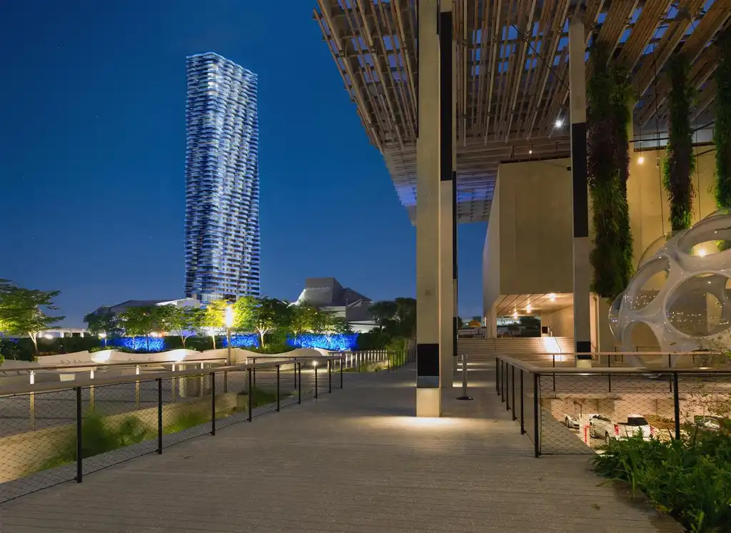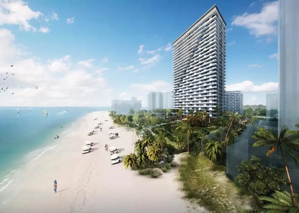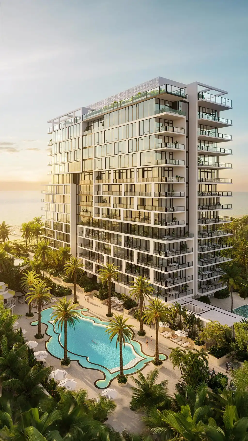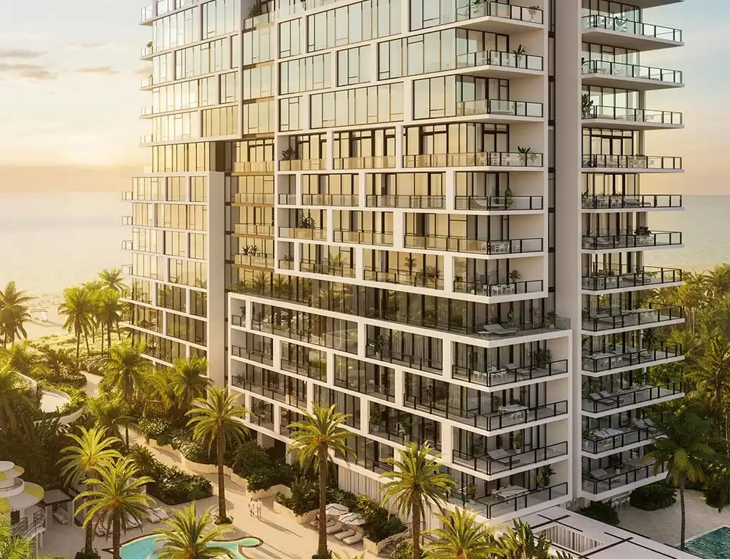 The design of the tower is a testament to elegance and sophistication, featuring a façade adorned with white columns and black mullions, creating a dynamic sense of rhythm and movement. This design choice is not merely aesthetic but functional, prioritizing large windows to ensure residences are bathed in natural light, enjoying the fresh air and stunning ocean vistas without obstruction.