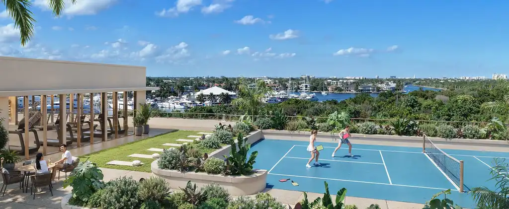Amenities are a real highlight. On the rooftop, residents enjoy a pool with 360-degree views, a sundeck with lounge chairs, a yoga terrace, a fitness studio with Technogym equipment, a steam room, an infrared sauna, an outdoor shower, a gourmet kitchen with a summer kitchen and an elevated pickleball court. For complete well-being, the space also includes a revitalizing ice-cold plunge.