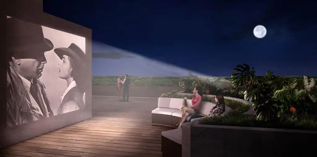 • Sunset roof deck with outdoor living rooms, fire lounge, and serenity gardens