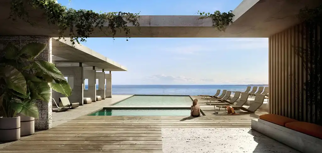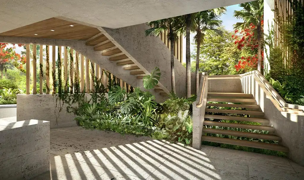 Shaped by The Grove’s deep regard for historical architecture and native landscapes, The Fairchild Coconut Grove embodies tropical modernist sensibilities by way of architect Max Strang’s signature use of natural stone, wood and concrete. Sweeping stairways and wood louvered breezeways offer stunning transitions from the social to the private, connecting the indoor to the outdoor.