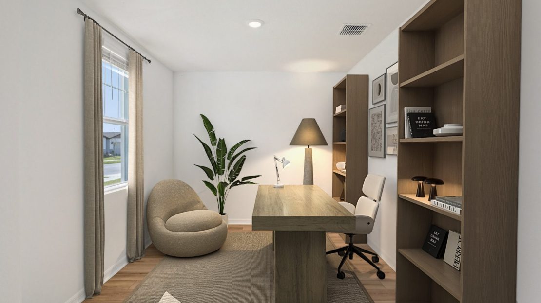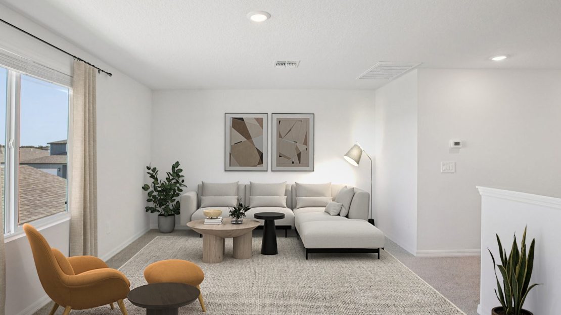 The Orchid features a first-floor primary suite for added privacy. Upstairs, a spacious loft is perfect for work or play. The open kitchen shines with a large island, ideal for cooking and entertaining.
