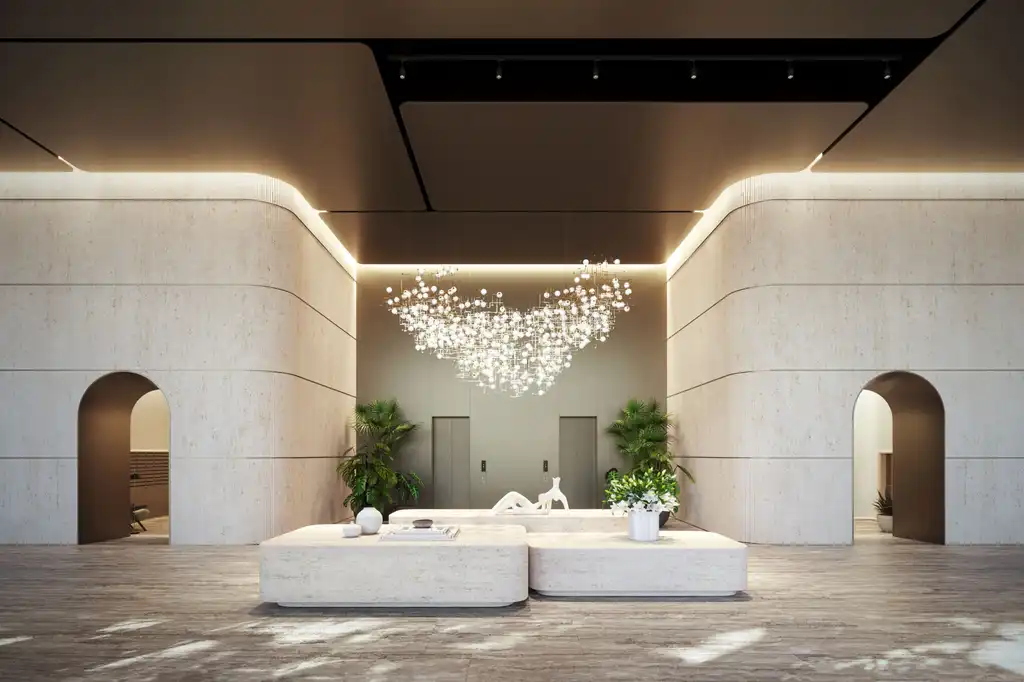 The building’s interiors integrate the private residences with 80,000 square feet of shared spaces that spread over the entire height of the tower, concentrating amenities at the top of the tower that opens to breathtaking views. The amenities include a swimming pool and spa with a relaxation area on the 70th floor, while the 67th floor features a double-height wine lounge with a refined selection of wines and works of art, office suites with private offices and lounge, and a bookable private dining room with a Vaselli kitchen in travertine. The 66th floor houses an expansive 930-sqm gym, with weight room, HIIT room and an indoor/outdoor yoga room.